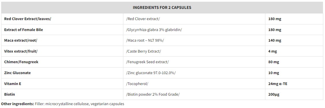 Ingredients: Red Clover extract, Glycyrrhiza glabra extract, Maca root extract, Vitex extract, Fenugreek extract, Zinc gluconate , Vitamin E, Biotin