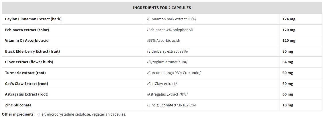 Ingredients: Ceylon Cinnamon Extract, Echinacea extract, Vitamin C , Black Elderberry Extract, Clove extract, Turmeric extract , Cat’s Claw Extract , Astragalus Extract, Zinc Gluconate