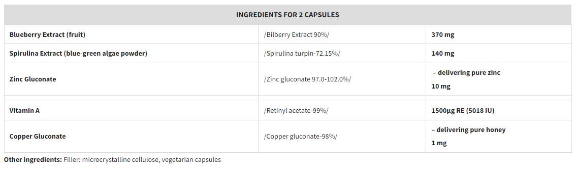 Ingredients: Blueberry Extract (Bilberry Extract 90%), Spirulina Extract (Spirulina turpin 72.15%) , Zinc Gluconate, Vitamin A (Retinyl acetate 99%), Copper Gluconate