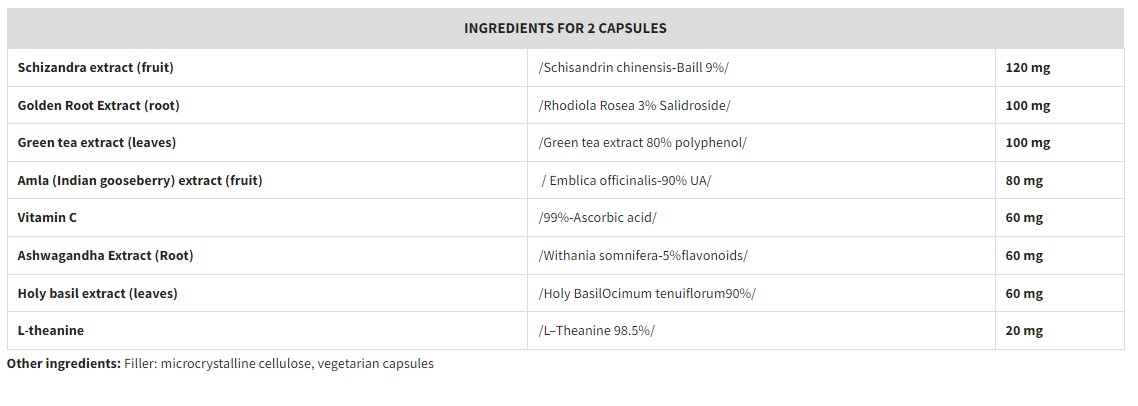 Ingredients: Schizandra extract, Golden Root extract, Green tea extract, Amla extract , Vitamin C, Ashwagandha extract , Holy basil extract , L-theanine