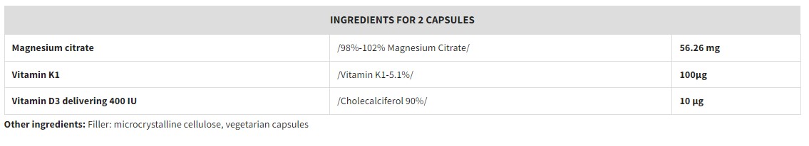 Ingredients: Magnesium citrate, Vitamin K1, Vitamin D3 (Cholecalciferol 90%)