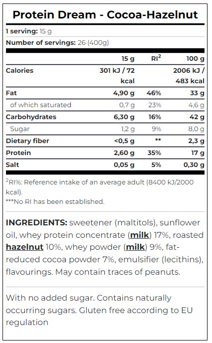 Ingredients: Maltitol, sunflower oil, whey protein concentrate (milk) – 17%, roasted hazelnut – 10%, whey powder (milk) – 9%, fat-reduced cocoa powder – 7%, lecithins, flavourings