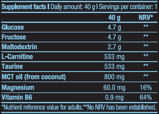 Glucose – 4 g, Fructose – 4.7 g, Maltodextrin – 2.7 g, L-Carnitine – 550 mg, Taurine – 550 mg, MCT oil (from coconut) – 800 mg, Magnesium – 60.9 mg, Vitamin B6 – 0.94 mg