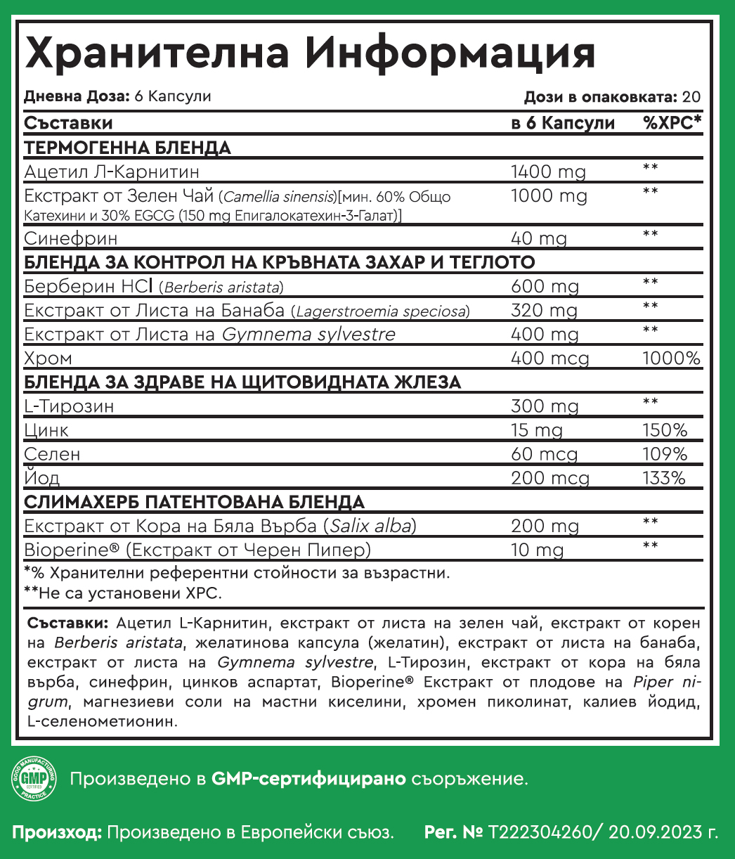 Acetyl L-carnitine, Green tea leaf extract (Camellia sinensis), Synephrine, Berberine HCl (Berberis aristata), Banaba leaf extract (Lagerstroemia speciosa), Gymnema sylvestre leaf extract, Chromium, L-tyrosine, Zinc, Selenium, Iodine, White willow bark extract (Salix alba), Bioperine® black pepper extract.
