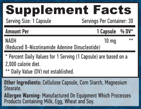 Ingredients: NADH, Cellulose Capsule, Corn Starch, Magnesium Stearate.