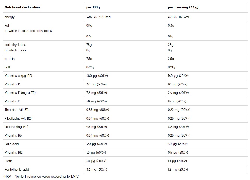 Cream of Rice by Olimp is a portion of complex carbohydrates with the addition of a vitamin complex (A, C, D, E, and B vitamins - thiamine, riboflavin, niacin, pantothenic acid, B6, biotin, folic acid, B12). The cream is easily digestible, has a smooth, pleasant texture when dissolved in water, and a sensational taste. Moreover, it can be prepared in literally no time!