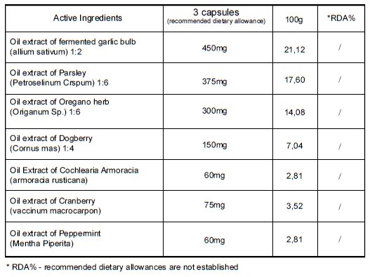 Ingredients: Extracts of fresh garlic, parsley, oregano, dogwood, horseradish, cranberry, peppermint.