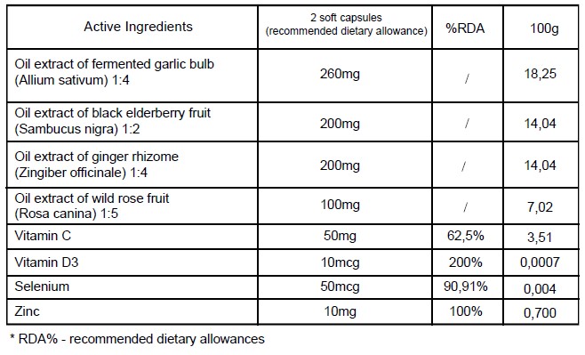 Ingredients: Extract of fermented garlic in soybean oil,Oil extract of black elderberry fruit in soybean oil,Oil extract of ginger root in soybean oil,Oil extract of rosehip fruit in soybean oil,Selenium,Zinc,Vitamin C,Vitamin D3