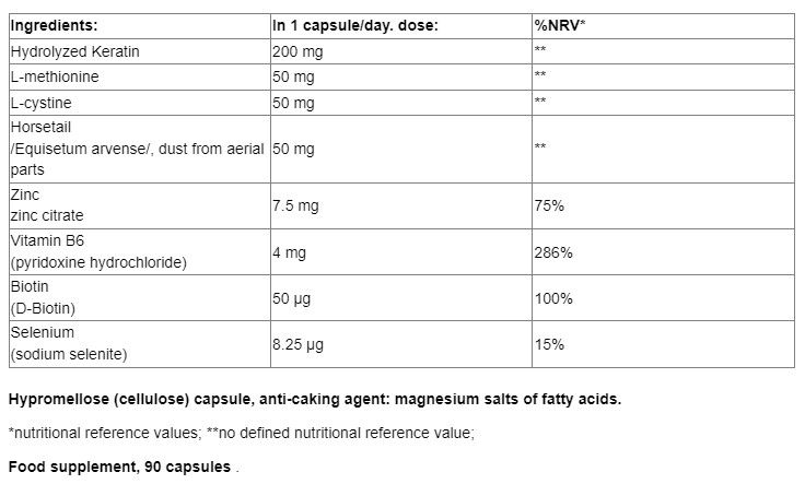 Ingredients: keratin, L-methionine, L-cystine, horsetail, zinc, vitamin B6, biotin, selenium.