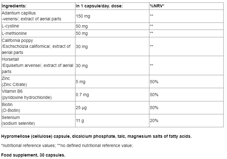 The zinc and vitamin B6 in this supplement ensure the good appearance and health of the hair, protect cells from the harmful effects of oxidative stress, and provide healthy, shiny, and soft hair.