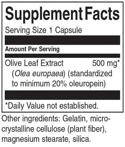 Ingredients: Olive leaf extract (Olea europaea) (standardized to minimum 20% oleuropein)