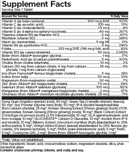 Vitamin A (beta-carotene), Vitamin C (ascorbic acid), Vitamin D3 (cholecalciferol), Vitamin E (d-alpha tocopheryl succinate), Thiamine, Riboflavin, Niacin, Vitamin B6, Folate, Vitamin B12 (cyanocobalamin), Biotin, Pantothenic Acid, Choline, Calcium, Iron, Iodine, Magnesium, Zinc, Selenium, Copper, Manganese, Chromium, Molybdenum, Boron, Dong Quai, Green Tea Extract, Soy Powder, Pomegranate Extract, Korean Ginseng Extract, Licorice Root Extract, Red Clover Extract, Black Cohosh Extract, DIM (diindolylmethane), Resveratrol, GLA (from borage oil), Lycopene, Lutein, Zeaxanthin, Astaxanthin, Cranberry Extract, Grape Seed Extract, DHEA, Guggul Extract, Inositol, PABA, Rutin, CoQ10