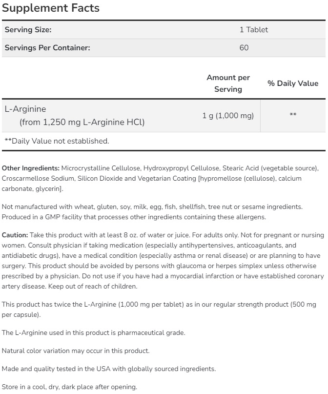 Double Strength L-Arginine 1000 mg / 60 Tabs