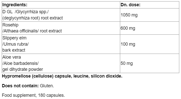 Ingredients: DGL (Glycyrrhiza spp.), Rosehip (Althaea officinalis), Slippery elm (Ulmus rubra), Aloe vera (Aloe barbadensis).