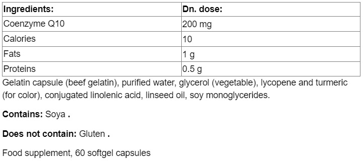 Coenzyme Q10, gelatin capsule (beef gelatin), purified water, glycerol (vegetable), lycopene and turmeric (for color), conjugated linolenic acid, linseed oil, soy monoglycerides