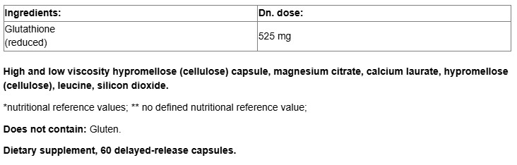 Glutathione is a naturally occurring antioxidant involved in the neutralization of free radicals and the regeneration of other antioxidants such as vitamins C and E. It plays a central role in detoxification, especially in the liver, and supports immune response and healthy aging. The sustained-release formula ensures prolonged activity and better bioavailability over time.