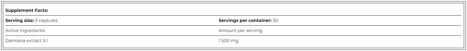 Ingredients: Damiana extract, HPMC (veggie capsule).