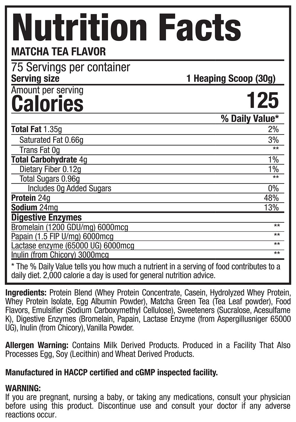 Ingredients:Protein blend (whey protein concentrate, casein, hydrolyzed whey protein, whey protein isolate, egg albumin powder), Matcha green tea (tea leaf powder), enzymes (bromelain, papain, lactase enzyme (from Aspergillus niger 65000 UG), inulin (from chicory), vanilla powder.