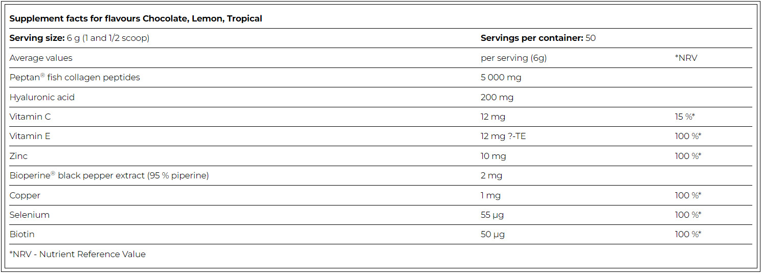 Hydrolyzed marine collagen (Peptan®), Hyaluronic acid, Vitamin C, Vitamin E, Zinc, Selenium