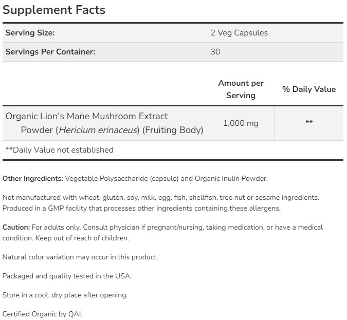 NOW Lion's Mane 500 mg / 60 Vcaps