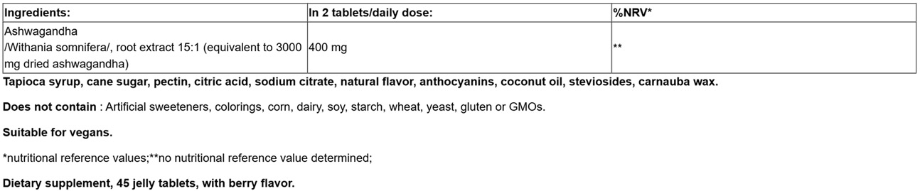 Ashwagandha (Withania somnifera) is a traditional root extract used to promote emotional well-being and physical stamina. The 15:1 extract concentration corresponds to 3000 mg of dried herb, providing a consistent amount of active plant compounds that help the body adapt to stress and support general resilience.