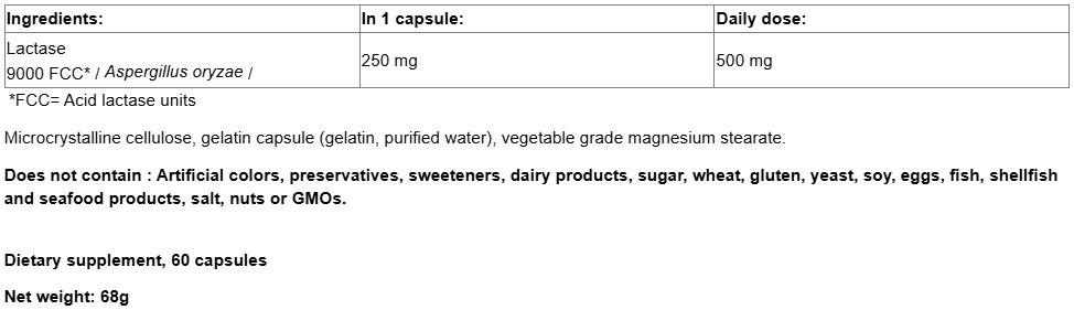 Ingredients: Lactase enzyme (Aspergillus oryzae), microcrystalline cellulose, gelatin capsule (gelatin, purified water), vegetable grade magnesium stearate