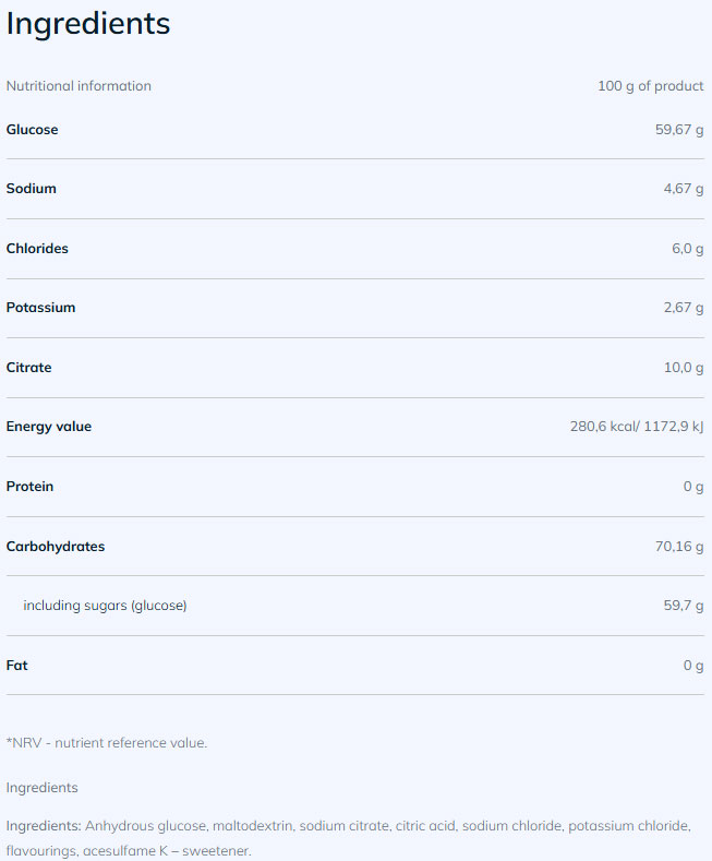The formula contains essential electrolytes like sodium, potassium, calcium, and magnesium, which are critical for maintaining fluid balance and preventing muscle cramps during exercise. Chloride supports proper osmotic pressure, while glucose contributes to quick energy restoration. The inclusion of citrate salts helps buffer acidity and supports performance during prolonged physical activity.