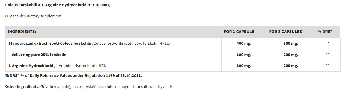Ingredients: Coleus forskohlii extract, L-Arginine hydrochloride