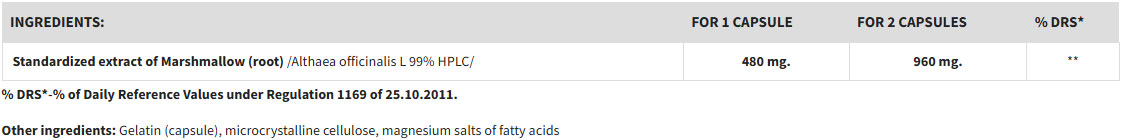 The product contains standardized extract of marshmallow root (Althaea officinalis), traditionally used to help maintain the comfort of the throat, mouth and stomach. Its natural mucilage forms a protective layer over irritated mucous membranes, offering a soothing effect on the digestive tract and the upper respiratory system. The high concentration of the root extract ensures effective support.