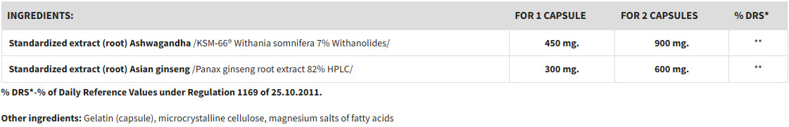 Ingredients: Ashwagandha extract (KSM-66® Withania somnifera, 7% withanolides), Asian ginseng extract (Panax ginseng, 82% HPLC)