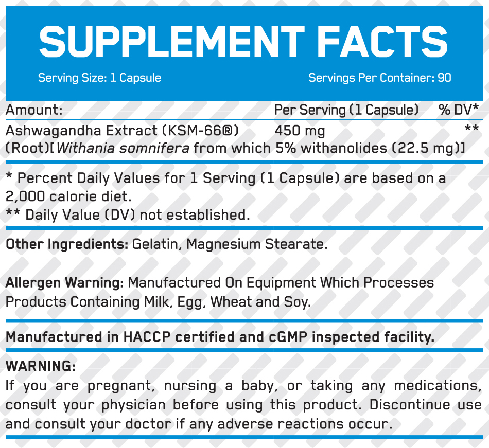 Ingredients: Ashwagandha root extract (KSM-66®), gelatin, magnesium stearate