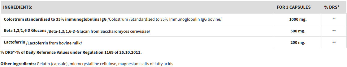 Ingredients: Colostrum (35% IgG), Beta 1,3/1,6 D Glucans, Lactoferrin