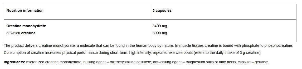 Ingredients: Micronized creatine monohydrate, microcrystalline cellulose, magnesium salts of fatty acids (anti-caking agent), gelatin (capsule)