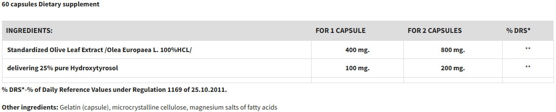 Ingredients: Olive Leaf Extract (standardized to 25% Hydroxytyrosol)