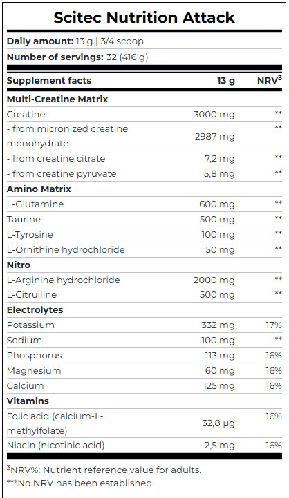 Creatine monohydrate – 2000 mg, micronized creatine – 2750 mg, creatine citrate – 1227 mg, creatine pyruvate – 1227 mg, arginine alpha-ketoglutarate – 2000 mg, L-ornithine hydrochloride – 1000 mg, beta-alanine – 1000 mg, L-citrulline malate – 500 mg, calcium – 120 mg (15%), potassium – 150 mg (8%), magnesium – 56.25 mg (15%), phosphorus – 105 mg (15%), vitamin B3 – 16 mg (100%), vitamin B6 – 1.4 mg (100%).