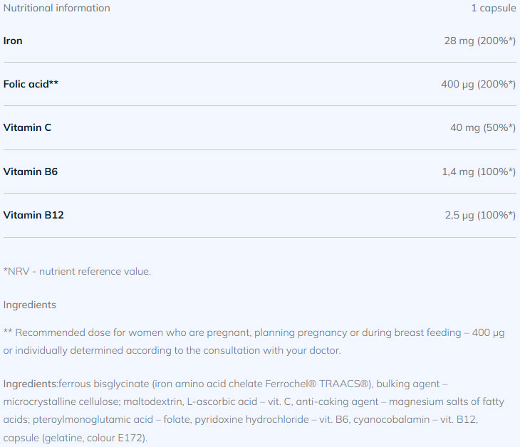 Iron in the form of Ferrochel® – a highly bioavailable iron bisglycinate chelate, which contributes to the formation of red blood cells and hemoglobin.
