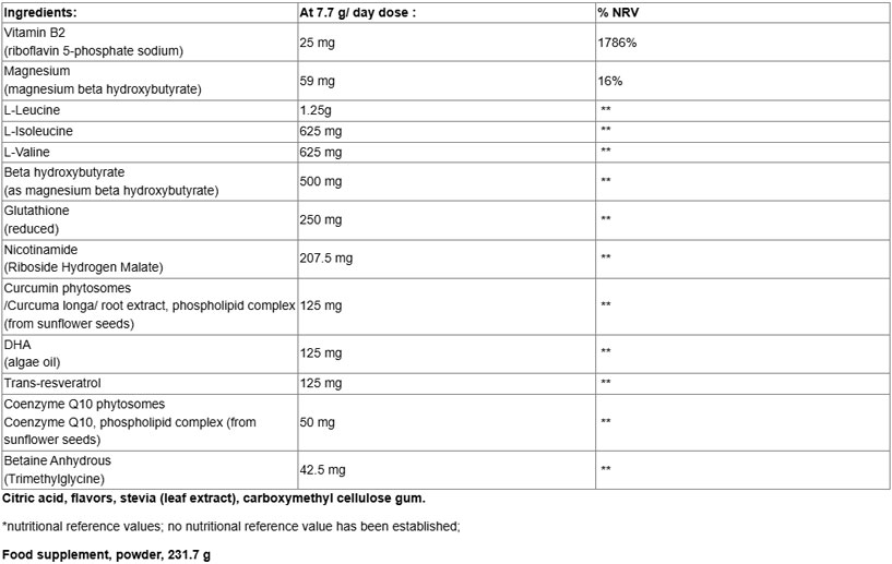 Vitamin B2 (riboflavin 5-phosphate sodium), Magnesium (magnesium beta hydroxybutyrate), L-Leucine, L-Isoleucine, L-Valine, Beta hydroxybutyrate (as magnesium beta hydroxybutyrate), Glutathione (reduced), Nicotinamide (Riboside Hydrogen Malate), Curcumin phytosomes (Curcuma longa root extract, phospholipid complex from sunflower seeds), DHA (algae oil), Trans-resveratrol, Coenzyme Q10 phytosomes, Betaine Anhydrous (Trimethylglycine).