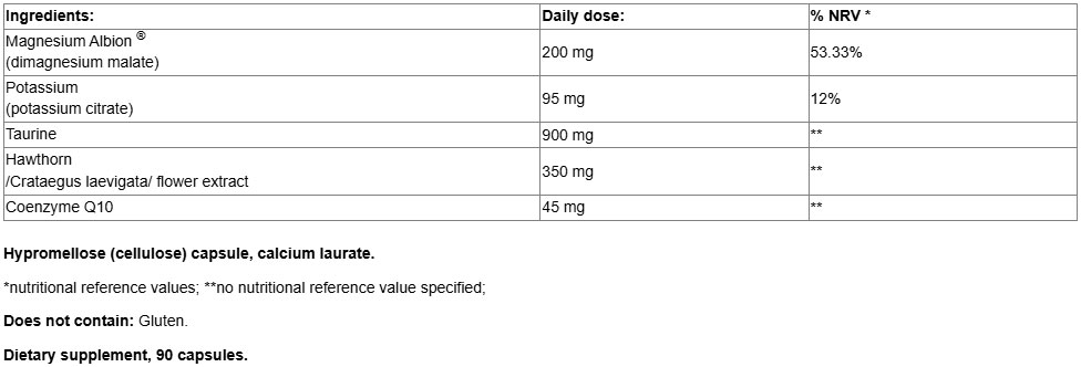 Magnesium Albion® (dimagnesium malate), Potassium (potassium citrate), Taurine, Hawthorn (Crataegus laevigata) flower extract, Coenzyme Q10.