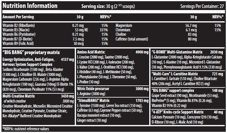 The array of ingredients in Big Bang 3.0 works synergistically to enhance your physical performance and overall health. These ingredients boost your energy and focus, allowing for a more intense and effective workout. Amino acids like L-arginine increase blood flow to the muscles, improving oxygen and nutrient delivery, while creatine boosts strength and endurance.