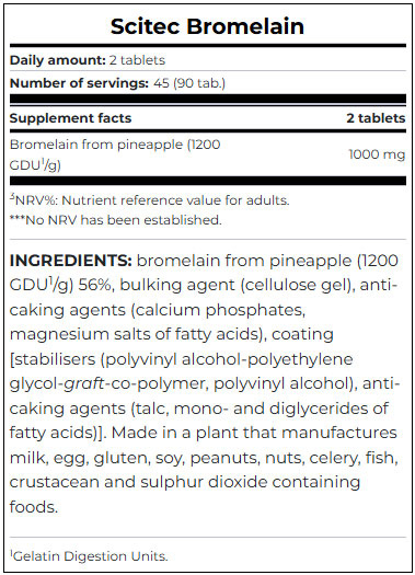 Ingredients: Bromelain – 500 mg (600 GDU), hydroxypropylmethylcellulose, dextrose, cellulose (plant origin), dicalcium phosphate, crosscarmellose, vegetable magnesium stearate, vegetable stearic acid