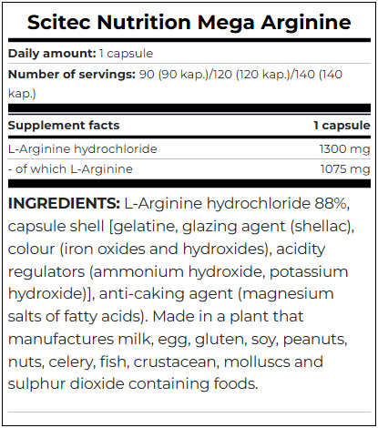 Mega Arginine by Scitec Nutrition encapsulates the potent benefits of L-arginine in each capsule, tailored to empower your health and fitness aspirations. Designed meticulously, this supplement serves as a vehicle to an enriched physical and internal health experience.
