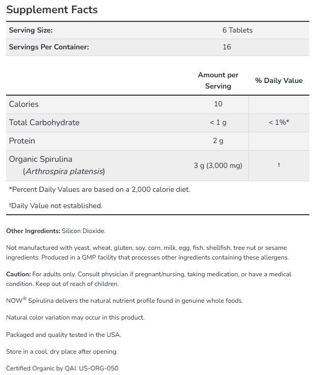 NOW Spirulina 500 mg, Organic / 100 Tabs