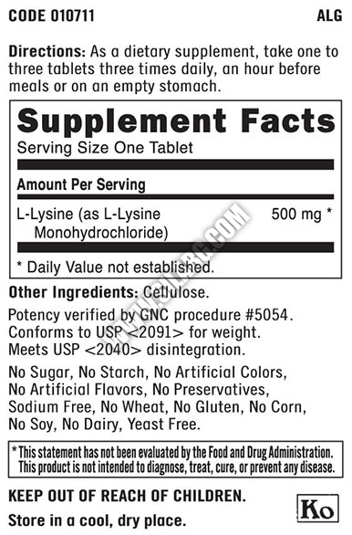 GNC L-Lysine 500 mg. / 100 Tabs.